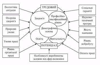 Під трудовим потенціалом розуміється розвинута в даному суспільстві сукупність демографічних, соціальних та духовних характеристик і якостей працеактивного населення, що реалізовані або можуть бути реалізовані в умовах досягнутого рівня розвитку продуктивних сил, науково-технічного прогресу та системи відносин щодо участі в процесі праці та суспільній діяльності. Природною основою формування трудового потенціалу є демографічне відтворення, що забезпечує безперервне поновлення поколінь людей як фізичних носіїв всіх соціальних якостей системи відносин. З іншого боку, трудовий потенціал — це є максимально можлива величина, що визначає участь трудящих у виробництві за екстремальних умов з урахуванням їх психофізичних особливостей, рівня професійних знань та набутого досвіду. Основними чинниками формування трудового потенціалу є такі (див. схему 3):