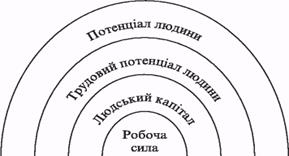 Стосовно окремо взятої людини взаємозв'язок між трудовим потенціалом та такими поняттями, як "потенціал людини", "людський капітал" та "робоча сила" можна представити у такий спосіб (див. схему 4 нас. 16):