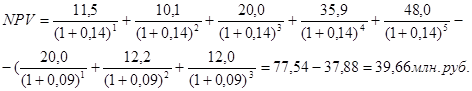 - величина чистой текущей стоимости по проекту А больше, чем по проекту Б (39,66 млн. руб. > 29,02 млн. руб.).
