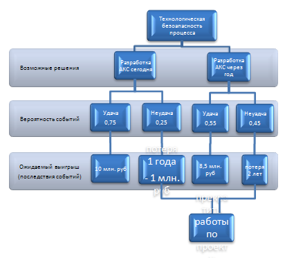 Разработку АКС можно начать немедленно, либо подождать год до выявления технологической безопасности процесса. Если разработку АКС начать немедленно, а производственный процесс окажется безопасным, то АКС окажется бесполезной и предприятие понесет убытки в размере 1 млн. рублей. Если процесс раз работки АКС отложить на один год, а производственный процесс не будет соответствовать установленным стандартам технологи ческой безопасности, то выпуск товара отодвигается на 1 год, до окончания исследований.