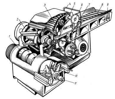 Рис. 1. Измельчитель кормов ИКВ-5В «Волгарь-5»: 1 – шнек; 2 – аппарат первичного резания; 3 – уплотняющий транспортер; 4 – скоба управления; 5, 6,7 – натяжные звездочки; 8 – подающий транспортер; 9 – натяжное устройство подающего транспортера; 10 – аппарат вторичного резания; 11 – автомат отключения.