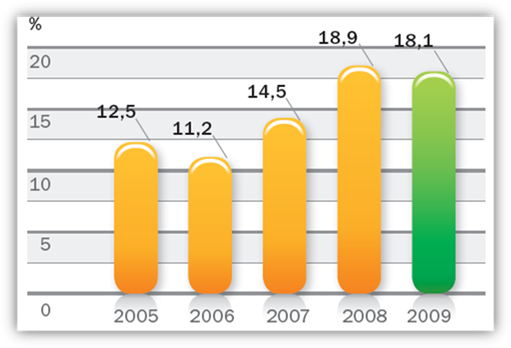 Несмотря на непростую экономическую ситуацию, по итогам 2009 года Банк добился существенного роста доходов от операционной деятельности. По сравнению с 2008 годом операционные доходы до создания резервов выросли на 44%, в то время как расходы, сопровождающие ведение бизнеса, увеличились лишь на 3,4%. Вместе с тем процесс создания резервов, вызванный объективной необходимостью, не затронул капитал Банка, но и не позволил получить весомую в сравнении с предыдущим годом прибыль.