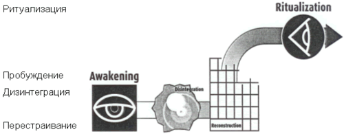 "Любой человек, группа людей или организация, преуспевшие во внедрении изменений, обычно проходят три стадии - пробуждение, переходный период, ритуализация достигнутого. Границы между этими стадиями носят размытый характер, а их продолжительность в разных ситуациях может быть различной".