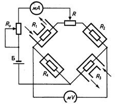 , за допомогою якого заздалегідь встановлюють певну величину струму живлення, контрольовану міліамперметром. Реохорд Rу цій схемі забезпечує можливість встановлення нульового показання мілівольтметра — покажчика напруги розбалансування мосту до початку вимірювань, коли камери резисторів R1