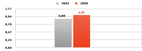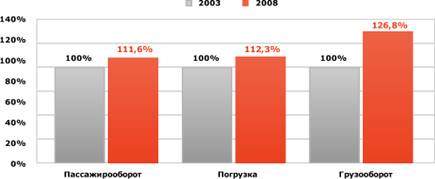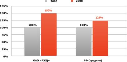 Существенно повышена внутренняя эффективность работы Российских железных дорог. Растущие объёмы перевозок выполнялись при оптимизации контингента, что позволило увеличить производительность труда более чем в 1,5 раза - вдвое выше, чем в экономике страны (1,24 раза)