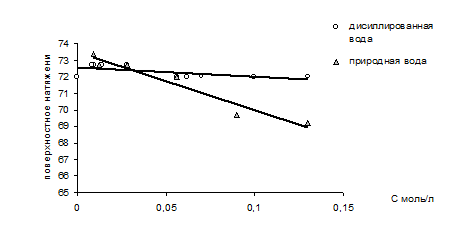 Из рисунка 2 следует, что в растворах с дистиллированной водой ТХУ не проявляет поверхностную активность, тогда как поверхностное натяжение природной воды в присутствии данного компонента незначительно изменяется обратно пропорционально увеличению концентрации растворов.