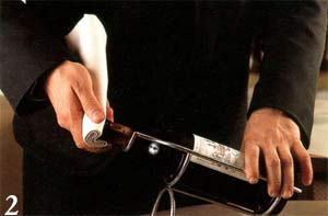 Затем лезвием специального ножа он срезает надпробочное покрытие либо посреди высоты, либо под кольцом горлышка. При этом избегают контакта вина с металлическим надпробочным покрытием бутылки.