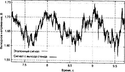 Исследование модели стенда проводилось с эталонными сигналами, соответствующими диапазону реальных скоростей жидкости в трубопроводе от 0,1 до 4 м/с (от минимального до номинального). Выяснилось, что стенд воспроизводит эталонный сигнал со всеми его особенностями с высокой точностью. Пример осциллограммы входного и выходного сигналов приведен на рис. 3.
