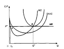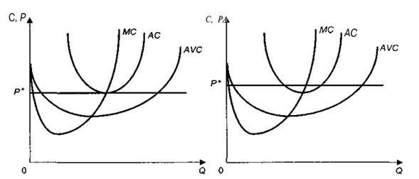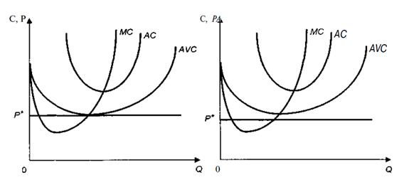 3. В краткосрочном периоде у фирм могут складываться различные соотношения между средними издержками и ценой. В зависимости от этого экономисты выделяют четыре типа фирм (рис. 3). Предположим, что в краткосрочном периоде для каких-то фирм рыночная цена оказывается на уровне средних переменных издержек (Р* = AVC). В этом случае фирма понесет убытки, поскольку ее средние общие издержки будут выше цены (АС > Р*). Однако какое-то время она будет продолжать работать, так как в противном случае ей грозят чистые убытки в размере постоянных издержек, которые существуют даже при нулевом выпуске. Такие фирмы получили название предельных.