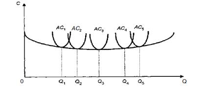 Каждая фирма в тот или иной момент имеет определенные масштабы производства, которым соответствует та или иная кривая средних издержек краткосрочного периода. Таких кривых существует столько, сколько масштабов производства исследуется. Меняя эти масштабы, фирма переходит от одной кривой средних издержек краткосрочного периода к другой. При этом средние издержки до определенного объема выпуска будут уменьшаться, а затем начнут постепенно возрастать (на рис. 4 это видно при переходе от АС1