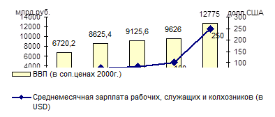 Рис. 2 - Динамика объема ВВП и уровня средней зарплаты по народному хозяйству Республики Беларусь (2005 г. – прогноз)