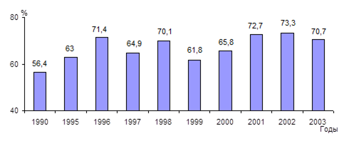 Всего же ожидается увеличение численности малообеспеченных граждан с 28,8% (по состоянию на 3 квартал 2003 г.) до 36,2%, т.е. на 7,4 п.п.