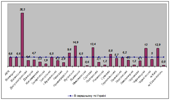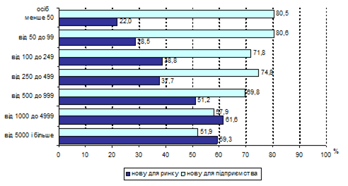За видами економічної діяльності найбільша частка інноваційно активних підприємств у переробній промисловості, зокрема на підприємствах з виробництва коксу, продуктів нафтоперероблення (33,3%), хімічній і нафтохімічній промисловості (21,6%) та машинобудуванні (23,3%). Питома вага інноваційних підприємств серед відкритих акціонерних товариств становила 22,7 %, закритих акціонерних товариств - 20,9 %, спільних товариств - 20,8 %, державних підприємств - 19,4 % [22].
