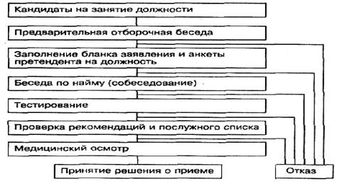 Окончательное решение при отборе обычно формируется на нескольких этапах, которые следует пройти претендентам. На каждом этапе отсеивается часть претендентов или же они отказываются от процедуры, принимая другие предложения. Типичный процесс принятия решения по отбору персонала представлен на рис. 3.