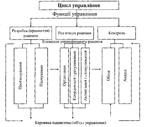 Виконання функцій управління у повному обсязі по всіх елементах складає цикл взаємодії керуючої (управляючої) підсистеми (суб'єкт управління) на керовану підсистему (об'єкт управління).