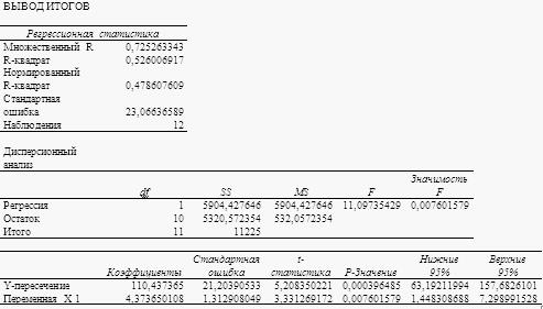 Из данного регрессионного анализа видно, что взаимосвязь между явлениями существует прямая и достаточно сильная. О сильной взаимосвязи говорит коэффициент детерминации (в таблице множественных R -квадрат), который очень высок по своей величине и равен 0,526, что близко по значению к 1.