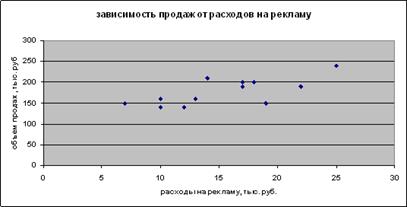 Исходя из построенного графика видно, что между расходами на рекламу и объемом продаж наблюдается прямая зависимость. Зависимость кроме того, достаточно тесная, что позволяет сделать вывод, полученный ранее, что увеличение затрат на рекламу приводит к росту объема продаж.