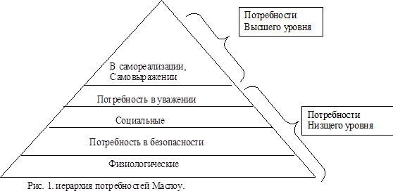Первые две группы потребностей первичные, а следующие три вторичные. Согласно теории Маслоу, все эти потребности можно расположить в строгой иерархической последовательности в виде пирамиды, в основании которой лежат первичные потребности, а вершиной являются вторичные (рисунок1).