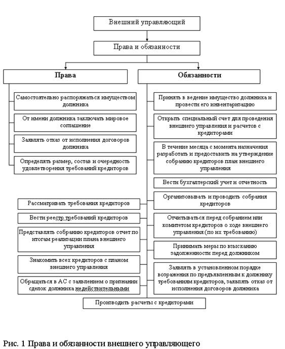 Законы о банкротстве разных стран рассматривают различные стадии процедур несостоятельности, но все они, как правило, начинающиеся с внешнего управления имуществом должника. На этой начальной стадии внешний управляющий имеет широкие полномочия, предоставленные либо судом (Франция, Германия), либо кредиторами во внесудебных процедурах (Великобритания и еще 70 стран англосаксонской правовой системы), и позволяющие изымать и продавать имущество должника, изучать информацию о должнике, учитывать интересы кредиторов, предлагать ликвидацию, мировое соглашение или реабилитацию должника (рис. 1).