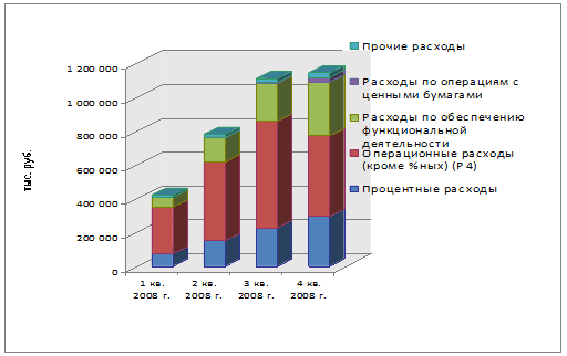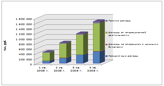 Активные операции банка с клиентами на 1 квартал 2008 г. составили 2 480 182 руб., на 2 квартал 2008 г. – 2 759 433 руб., на 3 квартал 2008 г. 3 003 339 руб., на 4 квартал 2008 г. 2 716 959 руб.