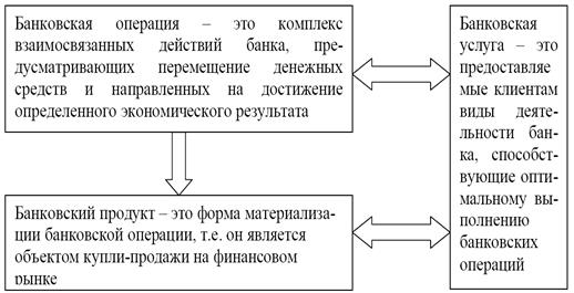 Исследование их внутренней взаимосвязи позволило установить, что банковская услуга способствует оптимальному выполнению банковской операции, а разработанные и реализованные банковские услуги в комплексе с банковскими операциями рождают банковский продукт.