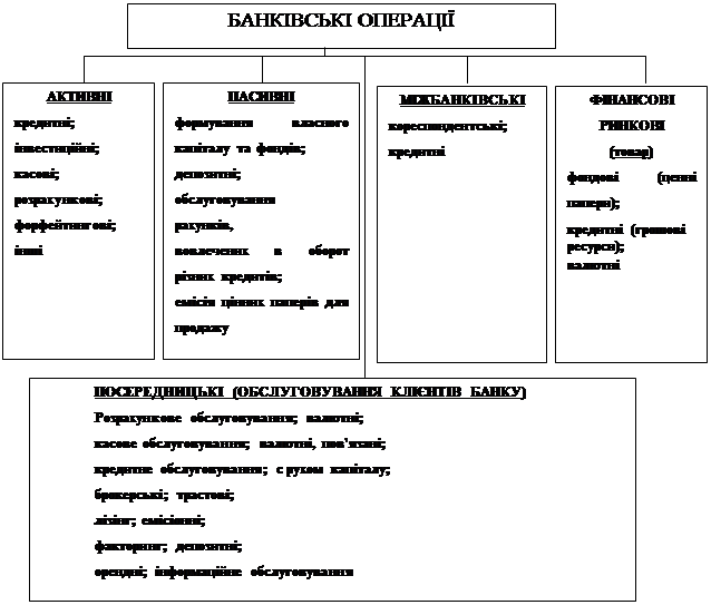 Серед активних операцій виділяють два головних види - кредитні (обліково-позичкові) і інвестиційні (операції з цінними паперами). При перші активи банку мають форму позичок, при других вони представлені цінними паперами, звичайно облігаціями компаній і державних органів. Кредитні операції можуть відрізнятися по терміновості позички, характеру забезпечення, тип позичальника, способу стягування відсотка й ін.