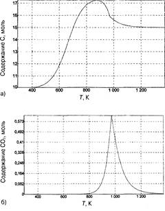 На рис. 2 приведены зависимости содержания пироуглерода и углекислого газа от температуры процесса. Расчеты показали, что содержание хлороводорода в пиролизных газах во всем интервале температур составляет менее 106