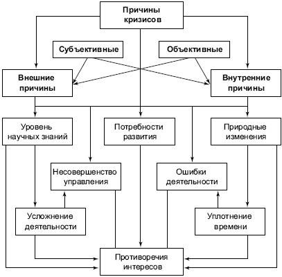 Причины кризиса могут быть различными. Они делятся на объективные, связанные с циклическими потребностями модернизации и реструктуризации, и субъективные, отражающие ошибки и волюнтаризм в управлении, а также природные, характеризующие явления климата, землетрясения и др.