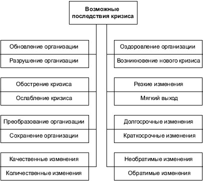В понимании кризиса большое значение имеют не только его причины, но и разнообразные последствия: возможно обновление организации или ее разрушение, оздоровление или возникновение нового кризиса. Последствия кризиса могут вести к резким изменениям или мягкому продолжительному и последовательному выходу. Разные последствия кризиса определяются не только его характером, но и антикризисным управлением, которое может смягчать кризис или обострять его.