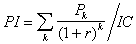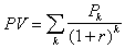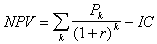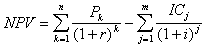 Допустим, делается прогноз, что инвестиция (IC) будет генерировать в течение n лет, годовые доходы в размере P1, P2, ..., Рn. Общая накопленная величина дисконтированных доходов (PV) и чистый приведенный эффект (NPV) соответственно рассчитываются по формулам: