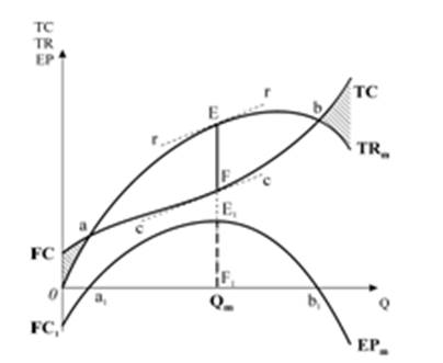 Мал. 4 ілюструє прийняття рішення монополістом за моделлю . Точки перетину кривих і  і є точками беззбитковості, а виробництво в межах обсягів, що відповідають цим точкам, є прибутковим. Відстань між кривими і по вертикалі показує величину економічного прибутку, крива якого побудована на графіку окремо. Відрізок відповідає його максимальній величині.