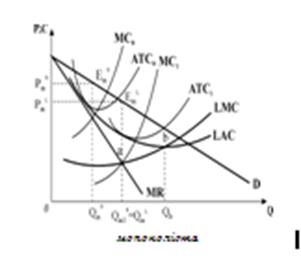 На мал. 6 зображені варіанти розвитку фірми з відповідними короткостроковими кривими середніх і граничних витрат, а також нанесені криві довгострокових середніх і граничних витрат і . Короткострокова рівновага монополії може встановлюватись у точках і . Кращим варіантом розвитку буде стан рівноваги , який одночасно є коротко- і довгостроковою рівновагою, оскільки в точці а перетинаються криві граничного виторгу і граничних витрат коротко – і довгострокового періоду: