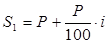 Дадим формулы для расчета будущих сумм S по начальному вкладу Р. В основе их построения лежит понятие единичного периода начисления (Т=1) и процентной ставки i, которая фиксирует процентное увеличение исходной суммы Р за первый период. В результате сумма на конец этого промежутка времени будет равна . Если ставка i измеряется десятичной дробью, то S1