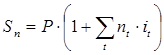 В отличие от простых для сложных процентов одна и та же ставка i берется для каждого последующего промежутка не от первоначальной суммы, а от результата предыдущего начисления, т.е. от суммы, наращенной на начало данного периода. Отсюда следует, что вклад Р при ставке сложного процента i через п периодов составит сумму