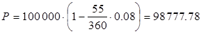 Пример. Тратта выдана на сумму 100 тыс.грн. с уплатой 17.11. Владелец документа учел его в банке 23.09 по учетной ставке 8%. Так как до погашения обязательства период равен 55 дням, то полученная сумма (без уплаты комиссионных) составит