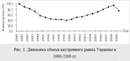 Рынок отечественных потребительских товаров — составная часть внутреннего рынка Украины, где находится в обращении товарная продукция, пользующаяся спросом домохозяйств, предприятий и органов государственной власти. Для расчета объема внутреннего рынка используется только стоимость продукции конечного потребления, то есть потребительских, инвестиционных товаров и услуг для населения. Этот принцип позволяет избежать ошибок, связанных с двойным учетом стоимости продукции, которая сначала поступает на внутренний рынок в виде сырья, затем полуфабрикатов и конечной продукции. Анализ динамики объема внутреннего рынка Украины в 1991-2009 гг. показывает, что он развивался неравномерно. В частности, по итогам почти десятилетнего роста объем внутреннего рынка к концу 2009 г. составлял 74,3% уровня 1990 г., а в 2008 г. — 96,4% (рис. 1).