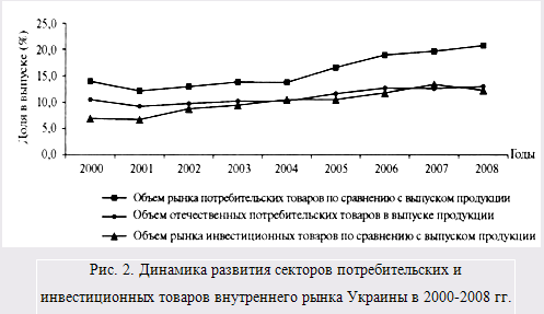 Данные рисунка свидетельствуют, что в течение периода экономического роста наиболее динамично на внутреннем рынке развивался сектор потребительских товаров. Так, в 2000—2008 гг. их доля в сравнении с выпуском товаров и услуг возросла на 6,8%, тогда как инвестиционных — на 5,4%, а отечественных потребительских товаров — на 2,6%. Каковы были последствия такого замедленного развития сектора отечественных потребительских товаров? Для потребителей это не имело никакого значения, за исключением того, что они все больше привыкали к потреблению продукции иностранных производителей. Для экономики Украины последствия были весомыми — ее конкурентоспособность в мировом хозяйстве постепенно уменьшалась. Она теряла способность динамично расширять товарное производство продукции в пределах мирового хозяйства и, соответственно, кардинально увеличивать доходы домохозяйств, предприятий и государства в ближайшей перспективе.