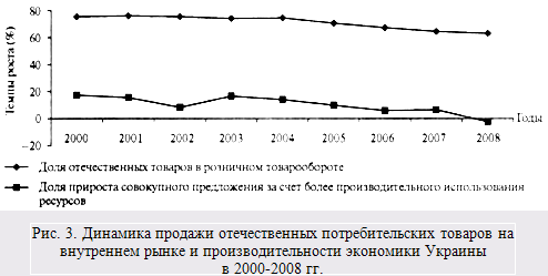 Коэффициент парной корреляции между показателями доли отечественных потребительских товаров в розничном товарообороте и производительности отечественной экономики высокий и равняется 0,86. Это объясняется следующим образом. В течение 2000-2008 гг. высокими темпами возрастало товарное производство первичных природных ресурсов: зерновых, масличных культур, железной руды, азотных удобрений, цемента и т. д. Его физические объемы начали приближаться к уровню 1991 г. или превышали его. Эти ресурсы и продукция их неглубокой переработки активно экспортировались на внешние рынки. Благодаря этому в 2000—2008 гг. средние годовые темпы прироста объемов экспорта продукции составляли более 20%. В то же время удельный вес отечественных товаров конечного потребления в совокупном предложении продукции на внутреннем рынке, начиная с 2005 г., постепенно уменьшался. Это означало, что отечественная экономика начала расти главным образом за счет увеличения продажи природных ресурсов при уменьшении глубины их переработки и, соответственно, эффективности использования, что привело к постоянной потере Украиной своих конкурентных позиций в мировом хозяйстве. Такую тенденцию показывают исследования аналитиков Всемирного экономического форума. Согласно последнему отчету этой организации, конкурентоспособность экономики Украины ухудшается, ее рейтинг в мировом хозяйстве снизился — с 72-го места в 2008—2009 гг. она перешла на 82-е в 2009—2010 гг..