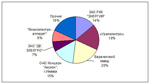 На предприятии работают более тысячи человек. За время, прошедшее с момента внешнего управления, среднемесячная зарплата возросла более чем в 3 раза. Предприятие работает в составе электротехнической промышленности и является одним из передовых в отрасли. Однако, к сожалению роль предприятия, в регионе, стране и международном разделении труда довольно мала, но предприятие не останавливается на достигнутом. Предприятие участвует в выставках, используется прямая почтовая реклама с целью ознакомления возможных потребителей с выпускаемой продукцией и завоевания еще большей доли рынка (см. рис.1). Неофициальными данными представлены следующие цифры (в штуках) конкурентоспособных предприятий, выпускающие аналогичную продукцию: