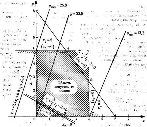 = 2, каждое из ограничительных линейных уравнений, а также линейная функция могут быть представлены геометрически в двухмерном пространстве (на плоскости).