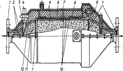 9 - дифузорная часть; 10 - устройство для подогрева; 11 - конфузорная часть; 12 - теплоизоляция