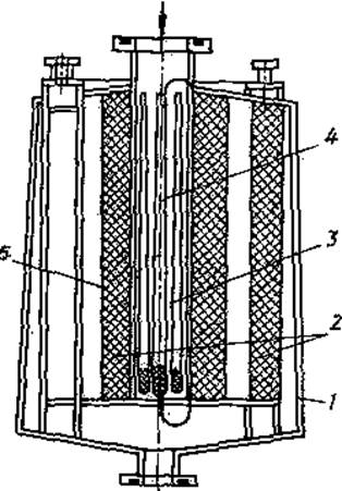 Рис. 4. Адсорбционный насос с обычным адсорбентом-катализатором: 1 - корпус; 2 - кассеты с адсорбентом; 3 - участок входного патрубка; 4 - прорези; 5 - сосуд с хладагентом
