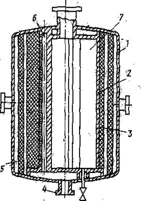 Несколько иным техническим решением отличается адсорбционный насос, показанный на рис. 5. В корпусе 1 насоса коаксиально расположен цилиндрический сосуд 2 с хладагентом, на наружной поверхности которого размещены адсорбент-катализатор 3, и размещена кассета 5. Для подвода регенерирующего газа служит патрубок 4. Цилиндрический сосуд имеет продольные П-образные выступы 7, между которыми в стенке сосуда находятся продольные каналы 6, сообщенные с патрубком 4 для подвода регенерирующего газа и открытые со стороны наружной поверхности сосуда 2.