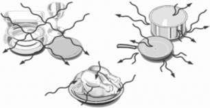Микроволны проникают в открыто расположенный продукт, а также продукт, помещенный в стеклянную, фарфоровую, керамическую, пластиковую и бумажную посуду.