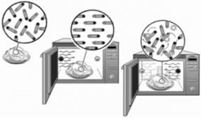 В естественном состоянии молекулы воды, находящиеся в продуктах, находятся в хаотичном состоянии. Под воздействием СВЧ-излучения молекулы воды сначала поляризуются, а затем, вобрав энергию СВЧ-излучения, начинают сталкиваться друг с другом и вызывают выделение большого количества энергии.