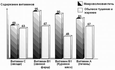 Микроволновый способ приготовления пищи сохраняет от 75% до 98% содержащихся в продукте витаминов (при традиционном способе сохраняется всего от 35% до 60% витаминов).