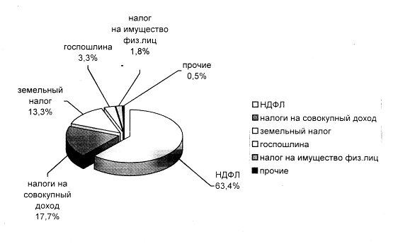 В структуре доходных источников, формирующих собственную доходную базу местных бюджетов в 2007 году, наибольший удельный вес занимают: налог на доходы физических лиц – 45,2%, земельный налог – 8%, налоги на совокупный доход – 14%. Значительную долю в доходной базе местных бюджетов составляют платежи, поступающие от использования муниципального имущества – 13%.