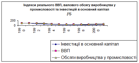 Побудуємо в одній площині графіки, які ілюструють динаміку валового внутрішнього продукту, інвестицій в основний капітал та обсягів виробництва у промисловості протягом досліджуваного періоду [1].