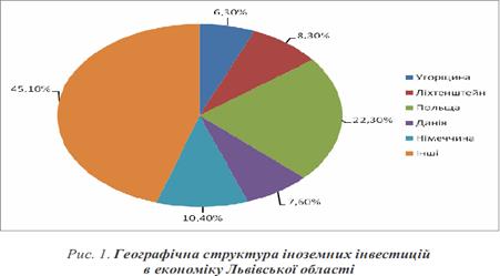 У Львівській області проводиться активна політика щодо залучення іноземних інвестицій. На одного мешканця у 2007 р. припадало понад 323 дол. США іноземних інвестицій, вкладення в економіку області здійснили партнери з 62 країн. Найактивнішими інвесторами є Польща, Німеччина та Угорщина (рис.1).