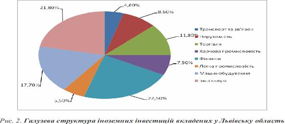 Пріоритетною для іноземного інвестування є промислова та фінансова сфери діяльності. Динамічно розвиваються торгівельна діяльність та сфера послуг, що зумовлена вигідним географічним положенням області. Важливу роль відіграє мале підприємництво. В області функціонує понад 120 тис. малих підприємств та 93,3 тис. підприємців - фізичних осіб. На 10 тис. осіб на Львівщині припадає 68 малих підприємств порівняно з 66 підприємствами по Україні [6]. Привабливими сферами для малого бізнесу є машинобудування, легка та харчова промисловість, виробництво деревини та виробів з неї (рис. 2).